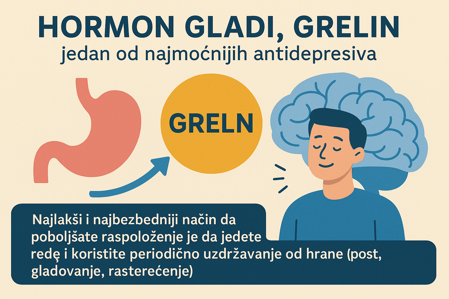 Osećaj gladi povezan je sa oslobađanjem grelina, a ovaj hormon deluje kao jedan od najmoćnijih prirodnih antidepresiva. On ne samo da poboljšava raspoloženje, već i jača dopaminski sistem i izaziva nagli porast dopamina. Tokom posta povećava se broj dopaminskih receptora, pa mozak postaje osetljiviji na nagradu i bolje funkcioniše.